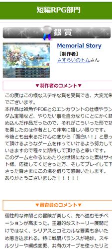 お疲れ様です。 このたび、なんと拙作Memorial Storyが「第14回 ふりーむコンテスト」にて「短編RPG部門 銀賞」を受賞いたしました!!!!!!! ありがとうございます!!!!!! 何で短編部門なのかはさておき、こうして目に見える形で結果を残せて良か…